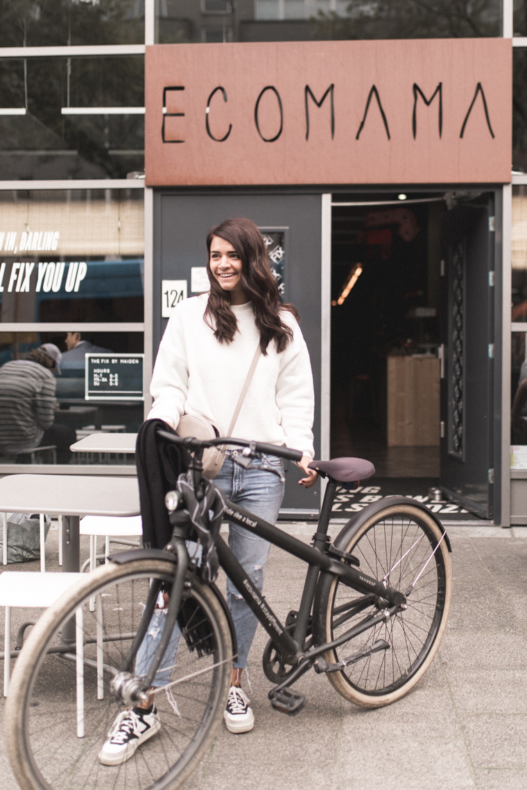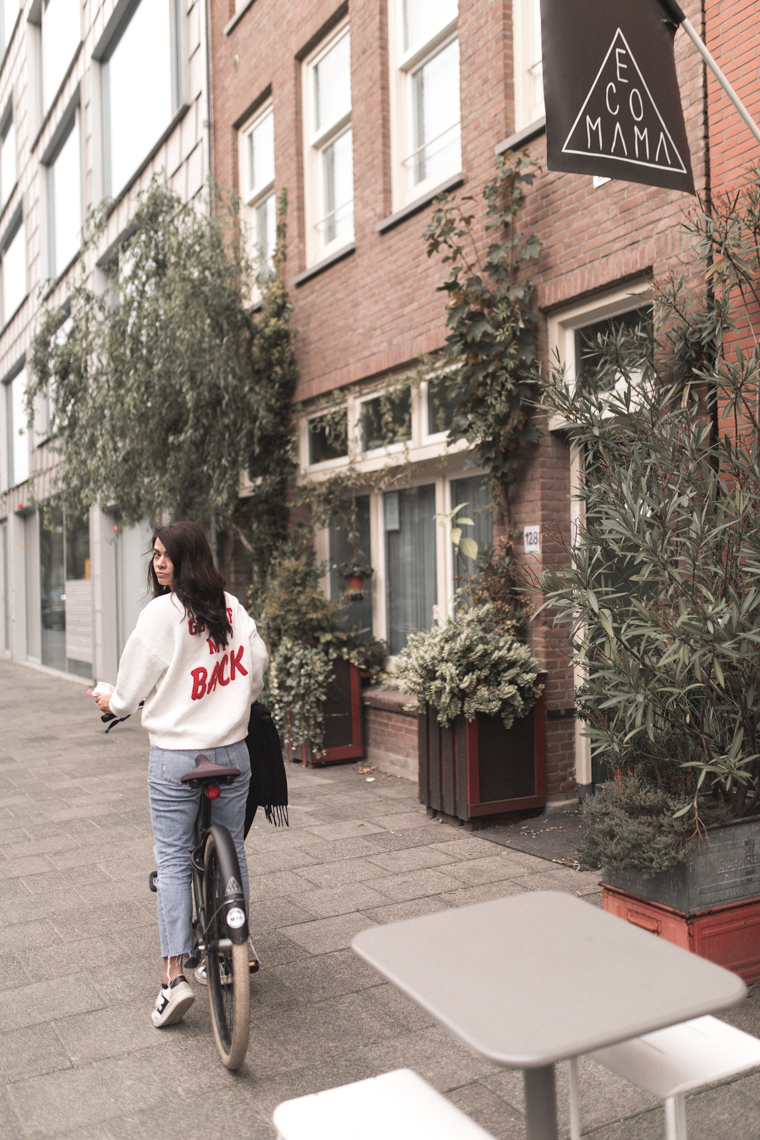 Ecomama befindet sich ca. 10 Gehminuten vom Bahnhof, super zentral also! Allerdings waren Nina und ich nie zu Fuß unterwegs. Beim Hostel kann man sich nämlich richtig coole matt-schwarze Räder ausborgen. Ursprünglich hatten wir eine Radtour als Tagesprogramm geplant, doch nach dem ersten Tag wurde schnell klar, dass das Rad unser täglicher Begleiter in Amsterdam werden wird. Mit dem Rad ist man einfach richtig schnell, sieht viele Gegenden in Amsterdam, bekommt ausreichend Bewegung (was dringend nötig ist, wenn man diverse Restaurants besuchen möchte) und obendrein macht es noch richtig viel Spaß!