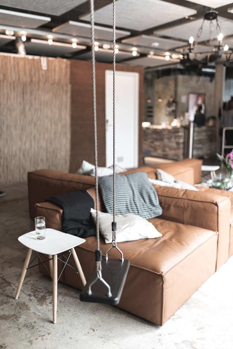 Bevor es ins Zimmer ging, wurde uns die Küche und der Aufenthaltsbereich gezeigt – wir waren baff: Ein riesengroßes Zelt dient als „Chill-out-Area“ mitten im Aufenthaltsbereich. Außerdem gibt es eine Schaukel, einige Sofas und einen kleinen Innenhof. Ein Paradies!