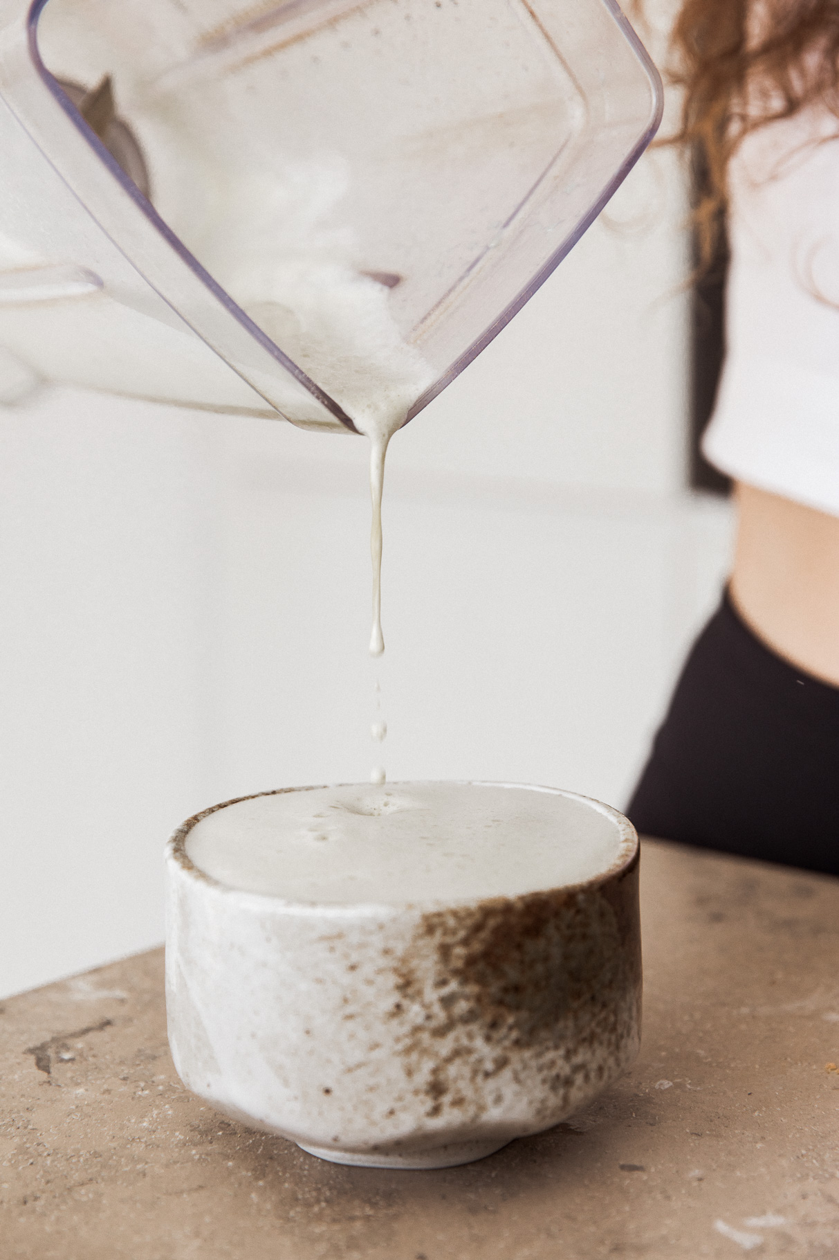 - 250ml pflanzliche Milch (ich verwende meist ungesüßte Hafer-, Mandel- oder Reismilch) mit 200 ml Wasser erwärmen