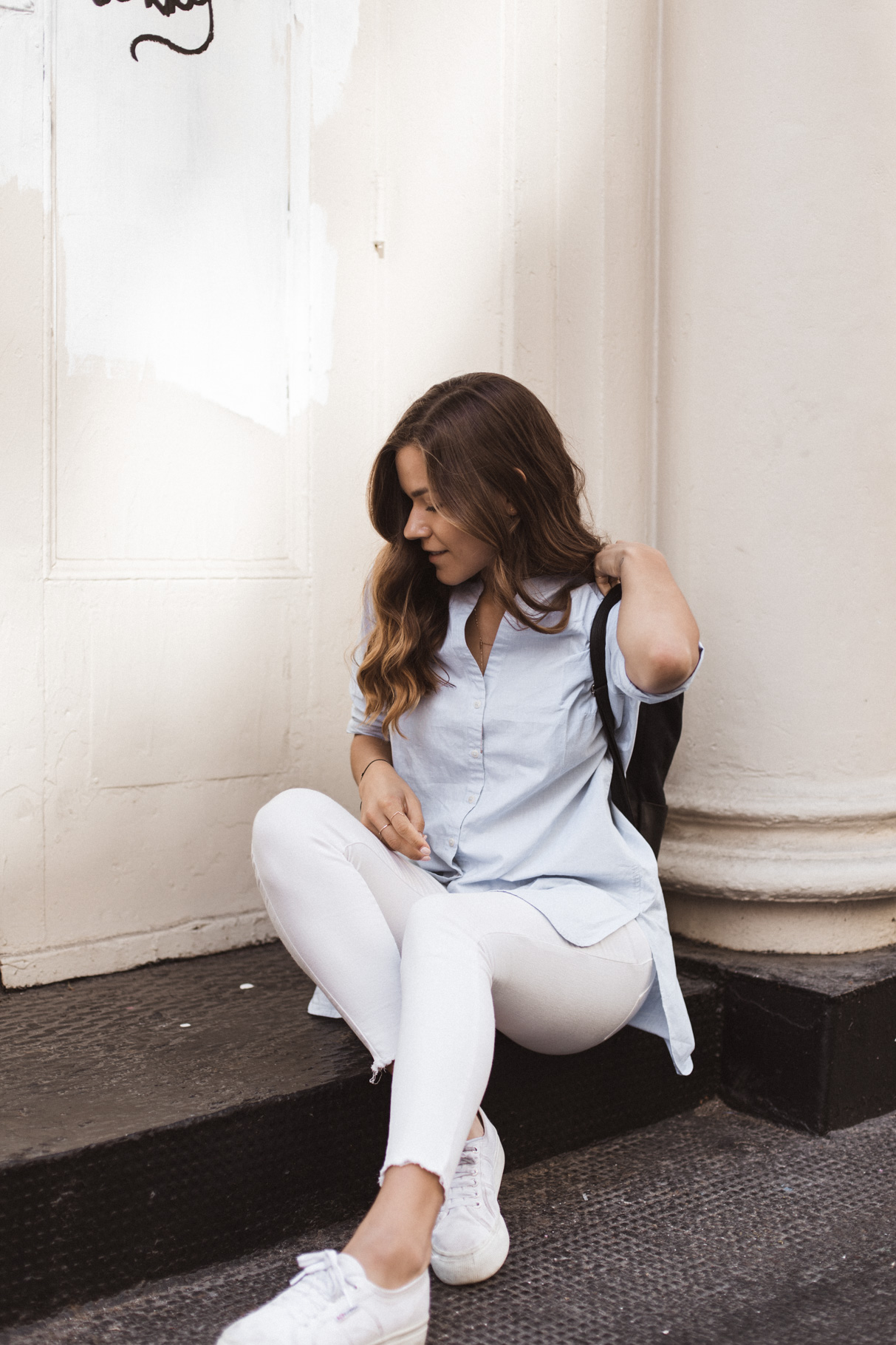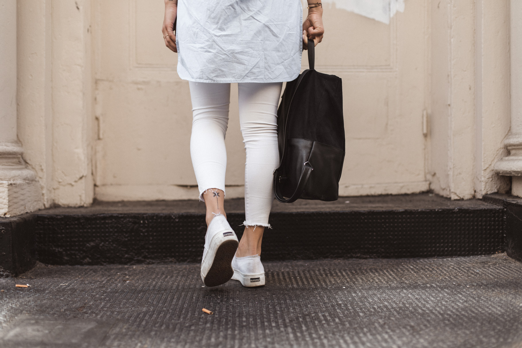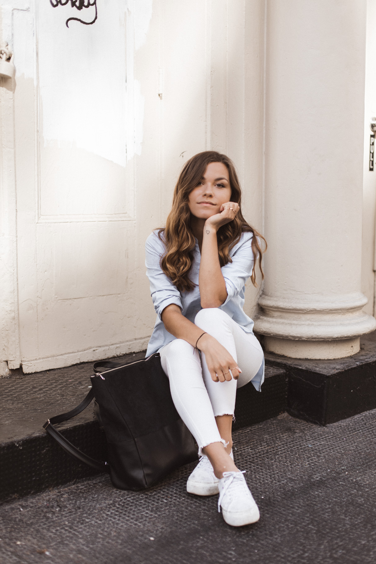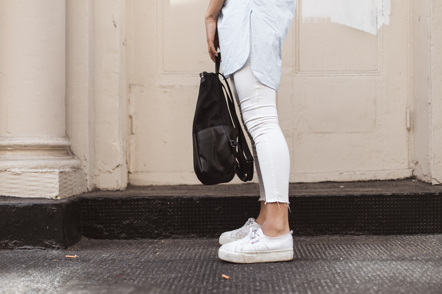 Ein nicht allzu heißer Sommertag, bummeln in der Stadt, ein bisschen Laptop-Time in einem Kaffeehaus – dafür ist das Outfit ideal. Gerade in New York muss man sich echt vor den Klimaanlagen wappnen. Deswegen habe ich mich für eine lange weiße Hose von River Island (schon alt, hier eine ähnliche) entschieden. Gepaart habe ich sie mit dem ARMEDANGELS Shirt von meiner Mama, das ich mir auch unbedingt holen muss (es ist gerade im Sale!!). Mein neuer täglicher Begleiter ist der vegane Rucksack von Lee Coren, der groß genug für mein 15” Macbook ist. Meine Schuhe sind vegane Plattform Schuhe von Superga.
