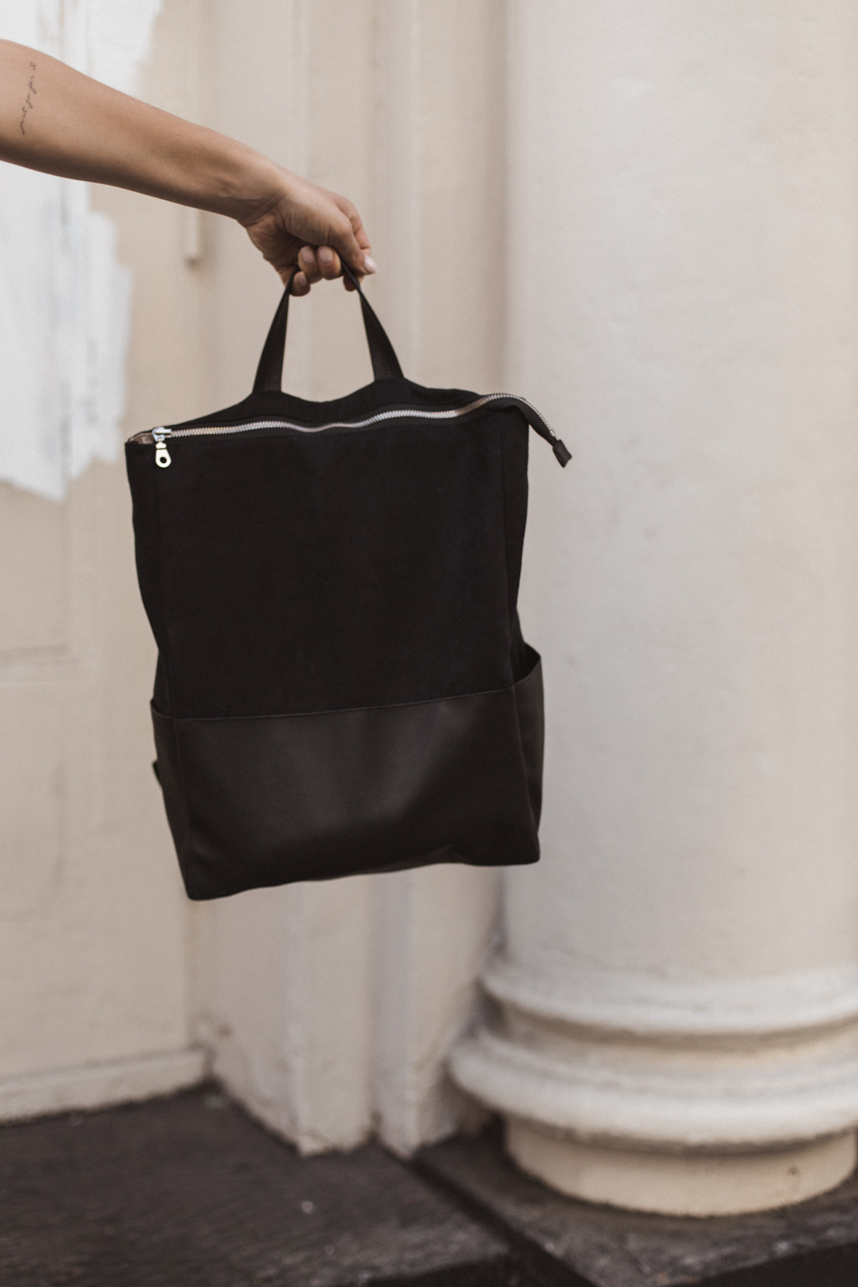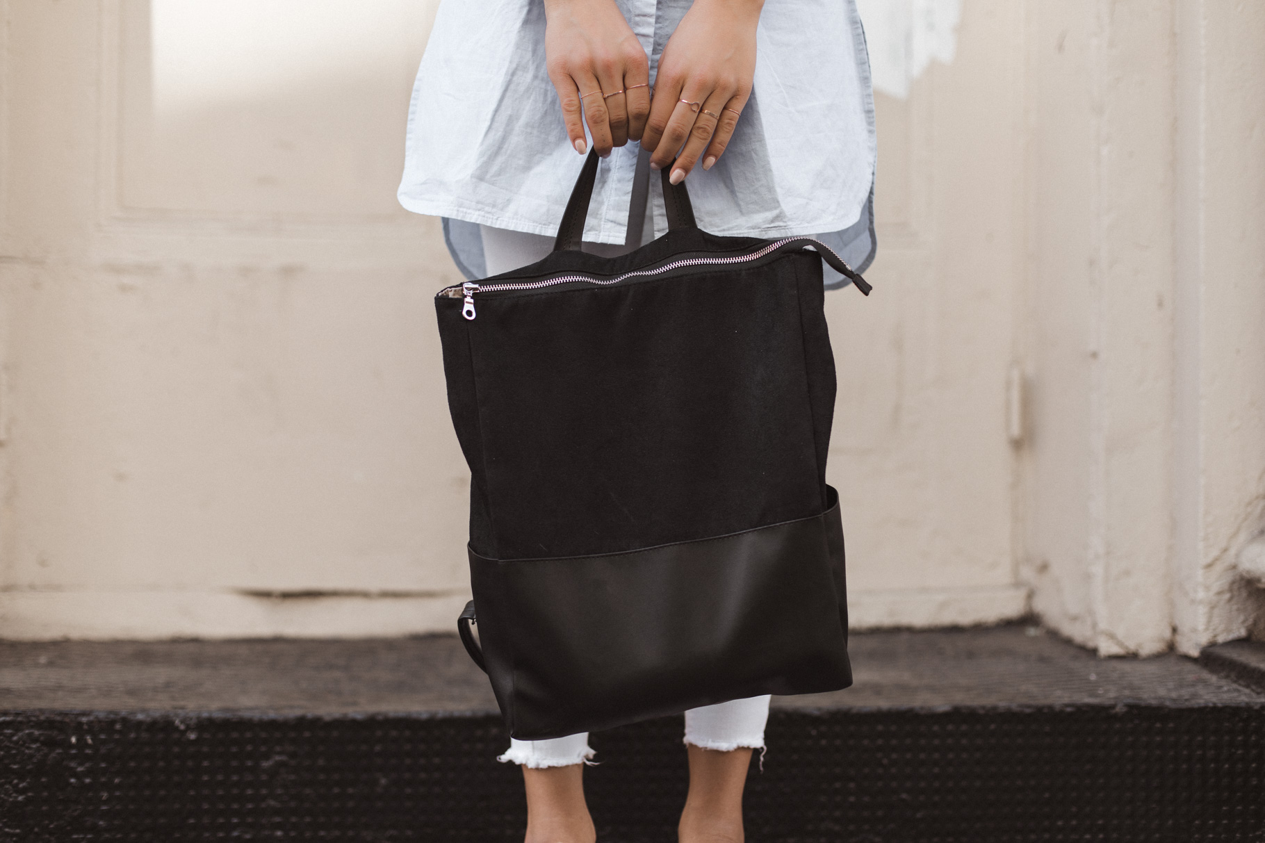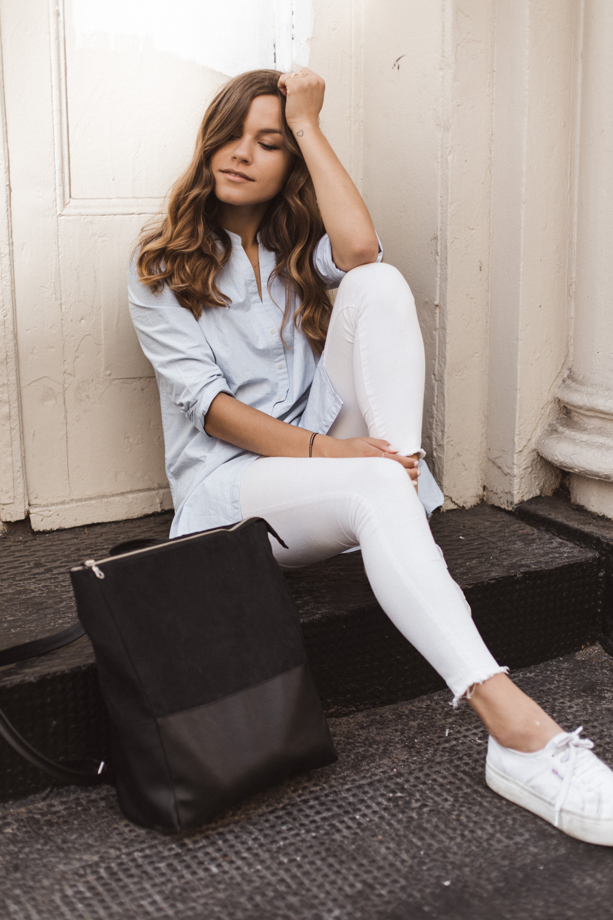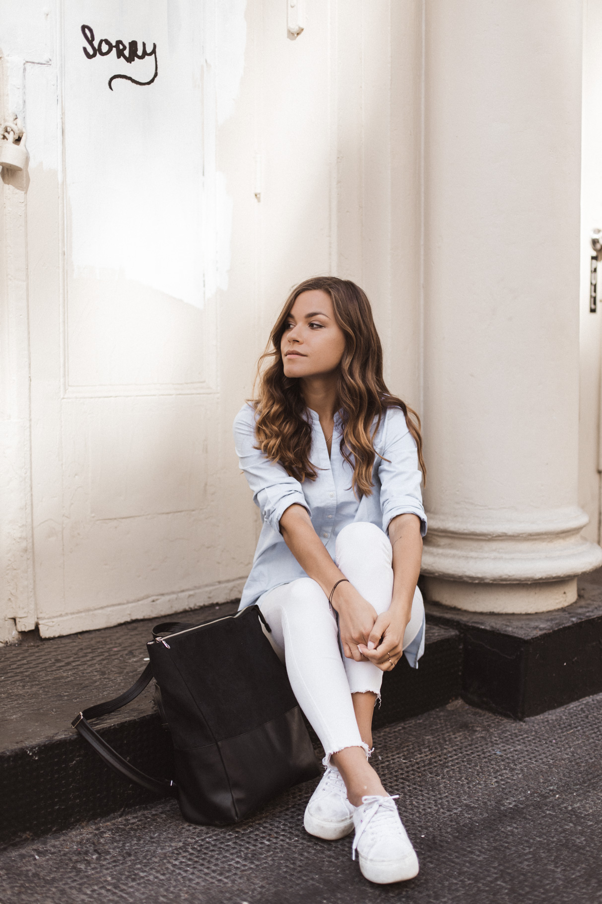 Ein nicht allzu heißer Sommertag, bummeln in der Stadt, ein bisschen Laptop-Time in einem Kaffeehaus – dafür ist das Outfit ideal. Gerade in New York muss man sich echt vor den Klimaanlagen wappnen. Deswegen habe ich mich für eine lange weiße Hose von River Island (schon alt, hier eine ähnliche) entschieden. Gepaart habe ich sie mit dem ARMEDANGELS Shirt von meiner Mama, das ich mir auch unbedingt holen muss (es ist gerade im Sale!!). Mein neuer täglicher Begleiter ist der vegane Rucksack von Lee Coren, der groß genug für mein 15” Macbook ist. Meine Schuhe sind vegane Plattform Schuhe von Superga.