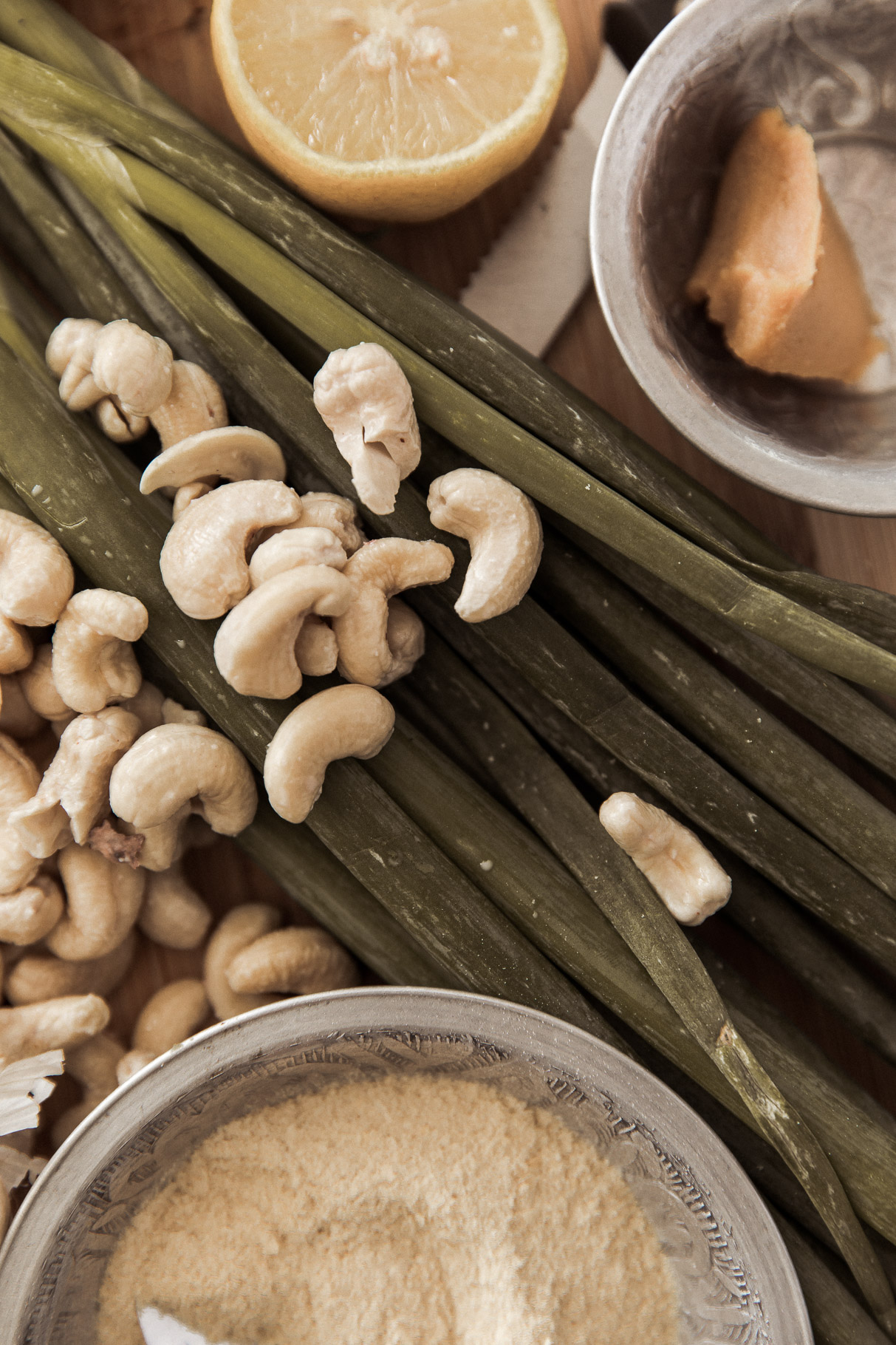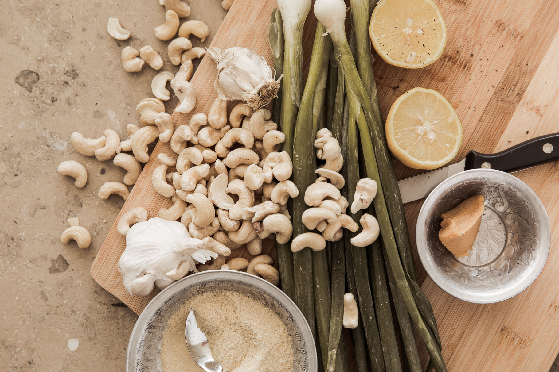 Eingeweichte Cashewkerne werden im Mixer so schön cremig und bilden daher eine perfekte Basis für veganen Käse. Miso und Hefeflocken verleihen der Rezeptur dann auch noch einen guten Geschmack nach Käse.