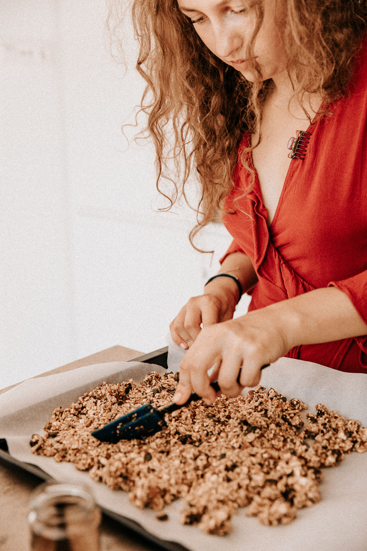 Hint: Falls ihr das Gefühl habt, dass das Granola in der Mitte vom Backblech noch nicht ganz trocken ist, zerkleinert einfach die Granolastücke, mischt alles noch mal etwas durch und gebt die Mischung erneut in den Ofen bei etwas niedrigerer Temperatur!