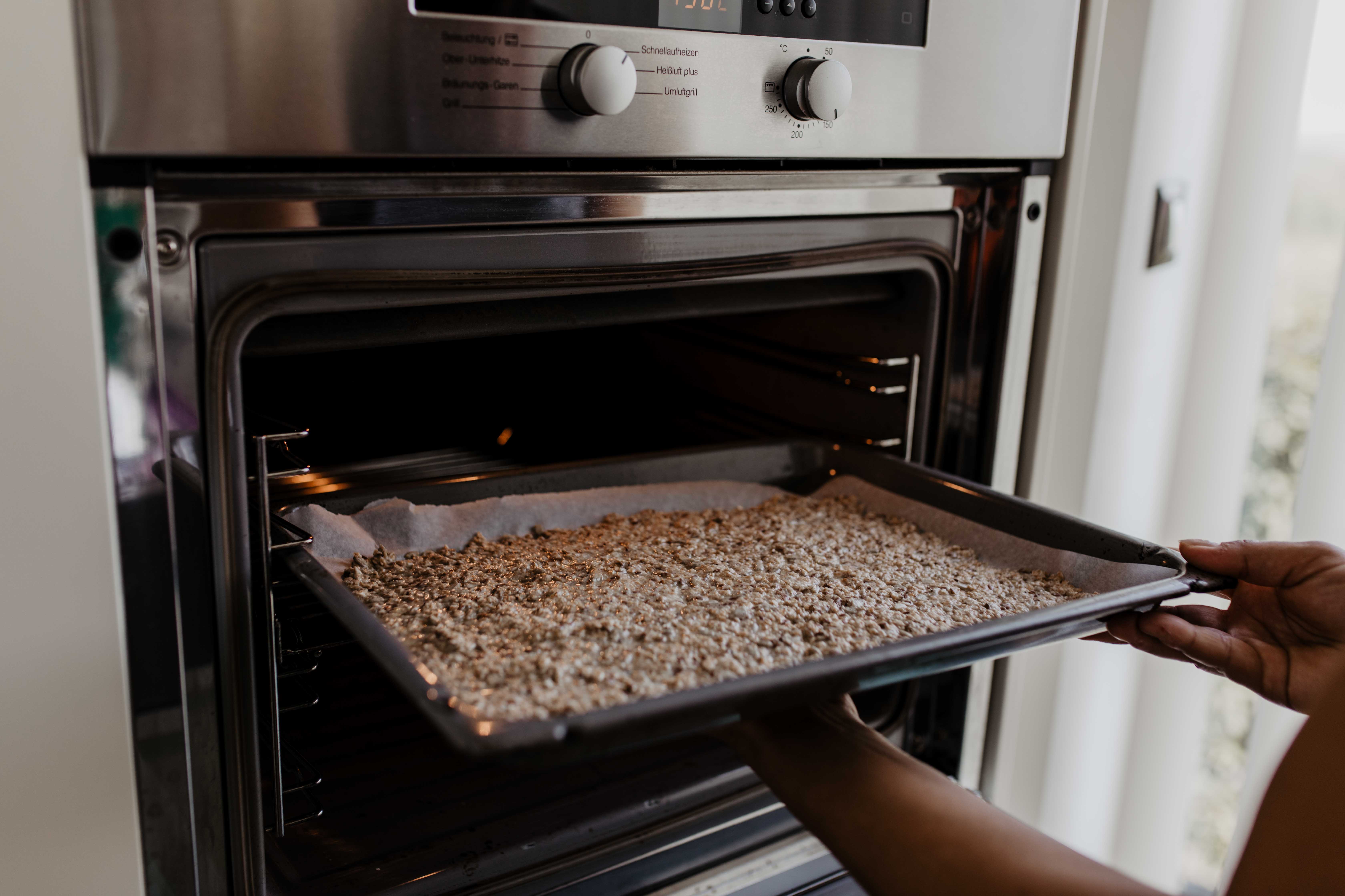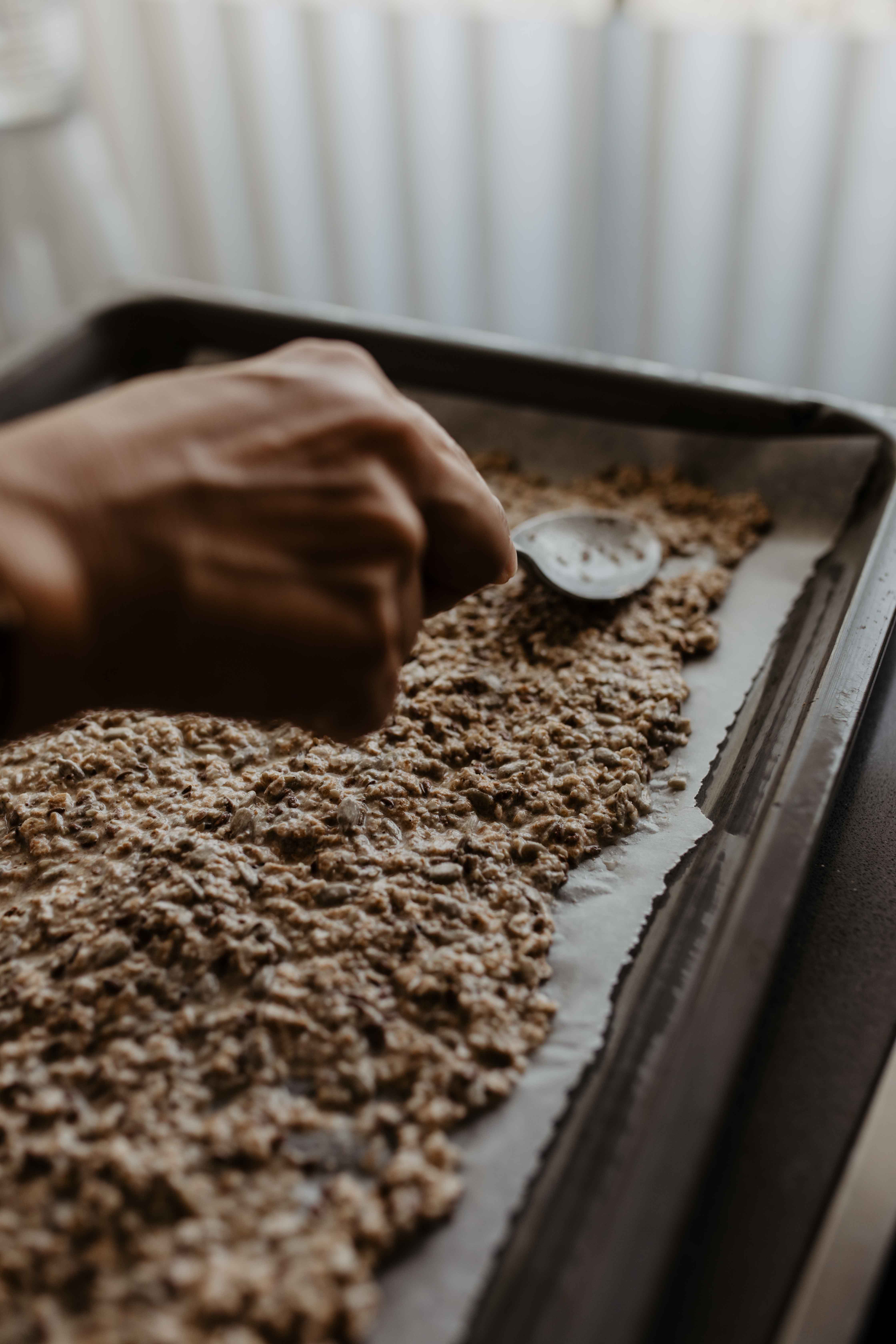 - Zwei Backbleche mit Backpapier auslegen und jeweils die Hälfte der Masse darauf verteilen. Ich verwende hierfür einen Löffel, um die Masse dünn zu verstreichen.