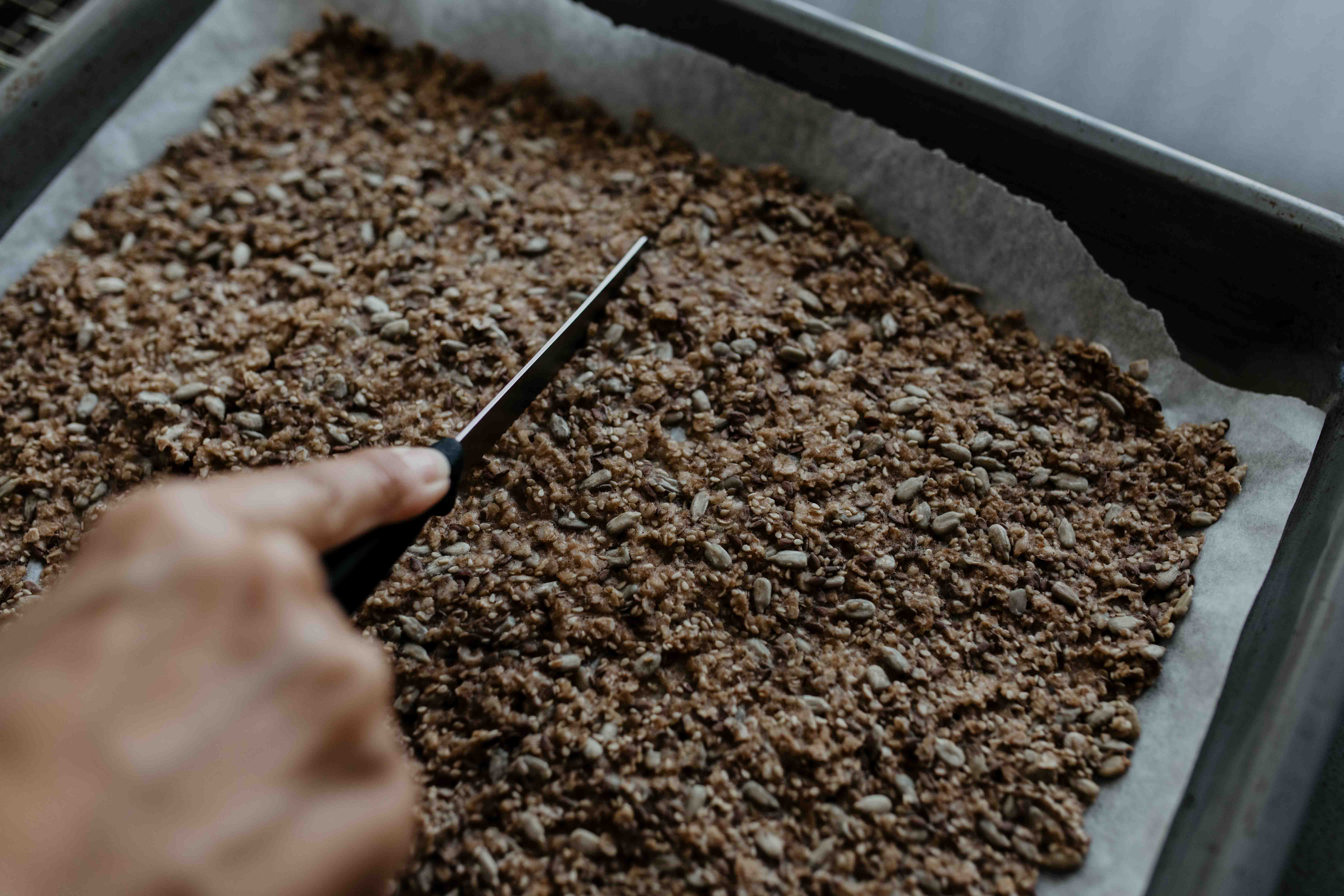 - Nach 10 Minuten nehmt ihr das Brot wieder raus und schneidet es in kleine Rechtecke. Später wäre das Brot bereits zu knusprig und würde brechen.