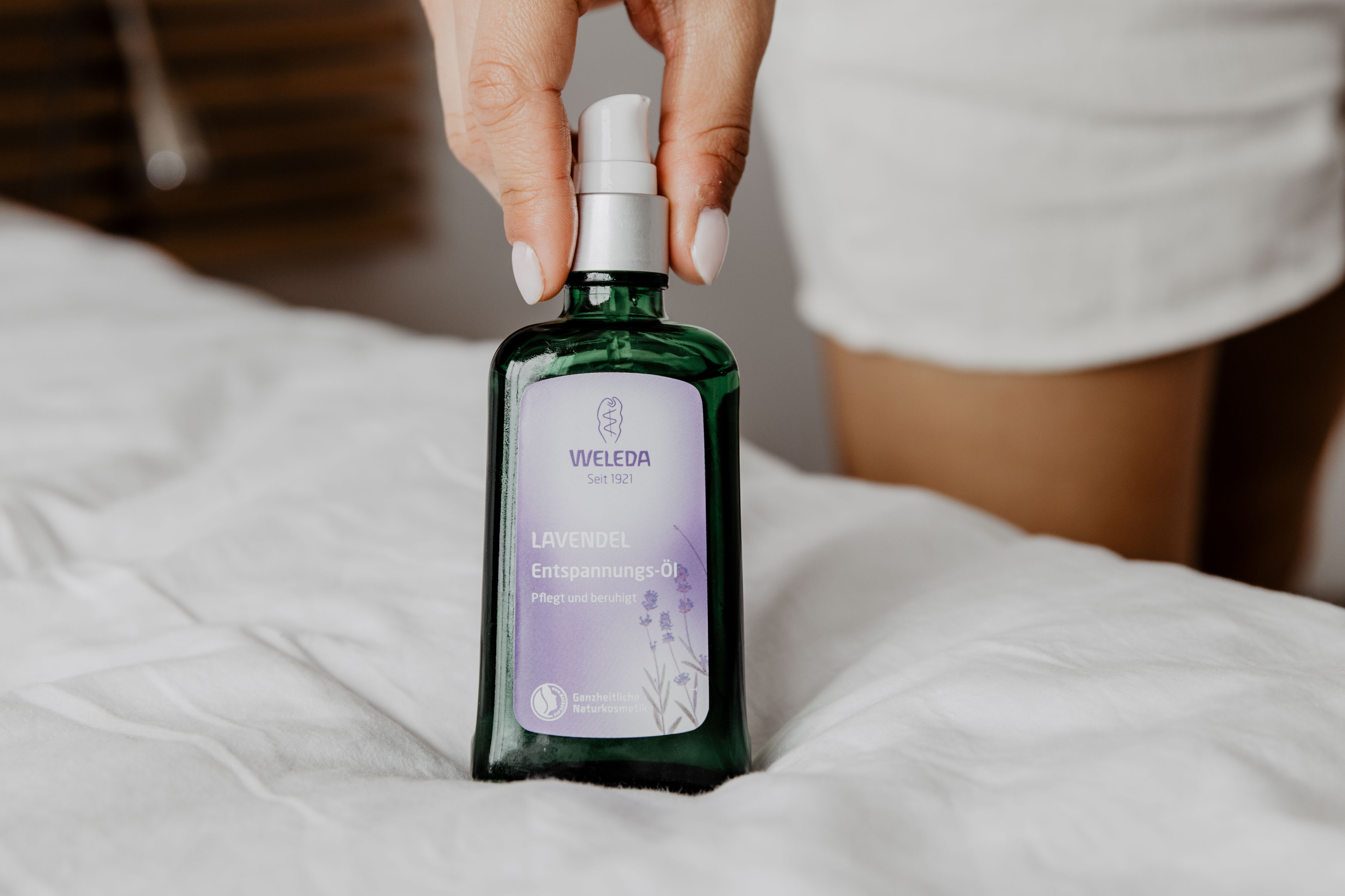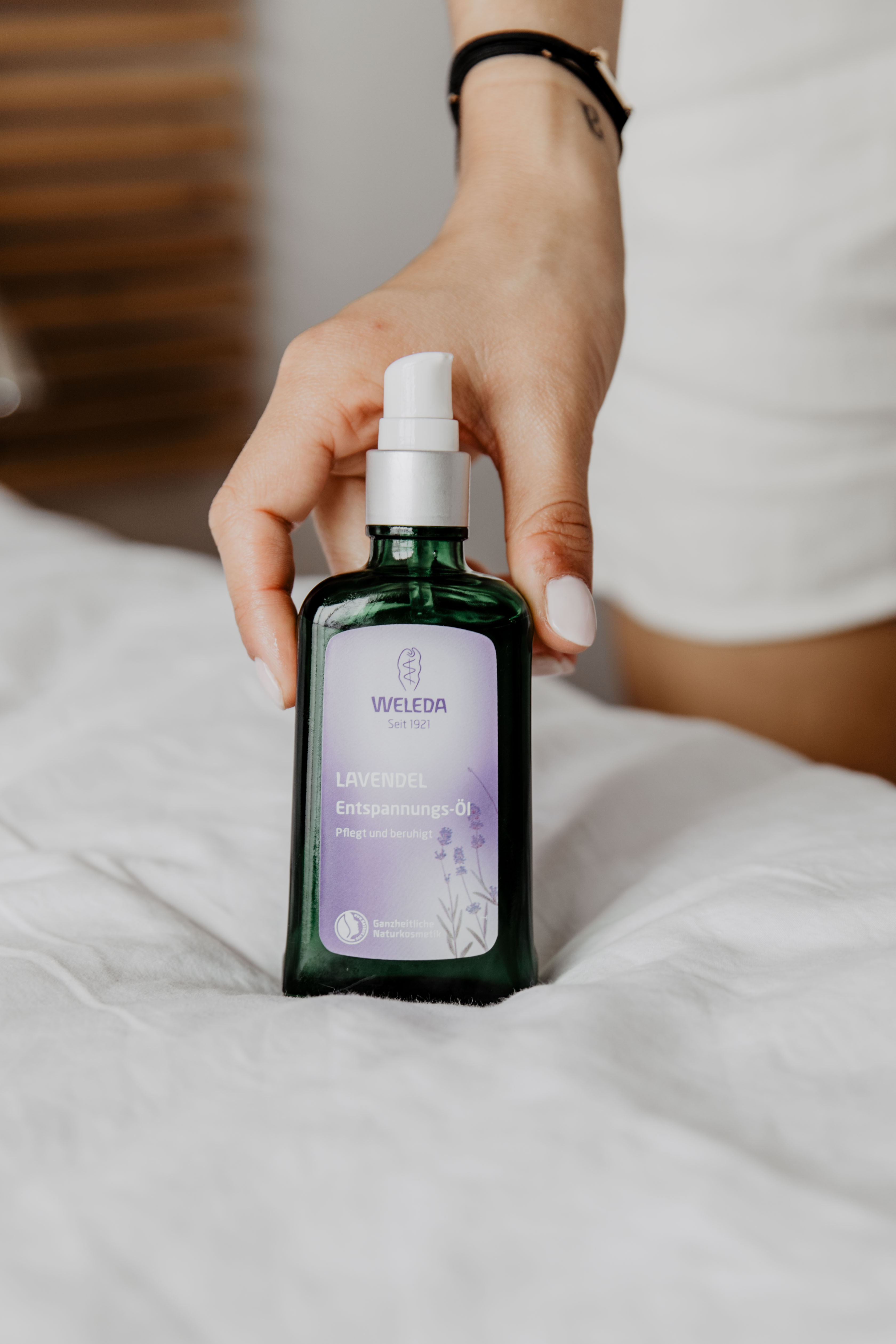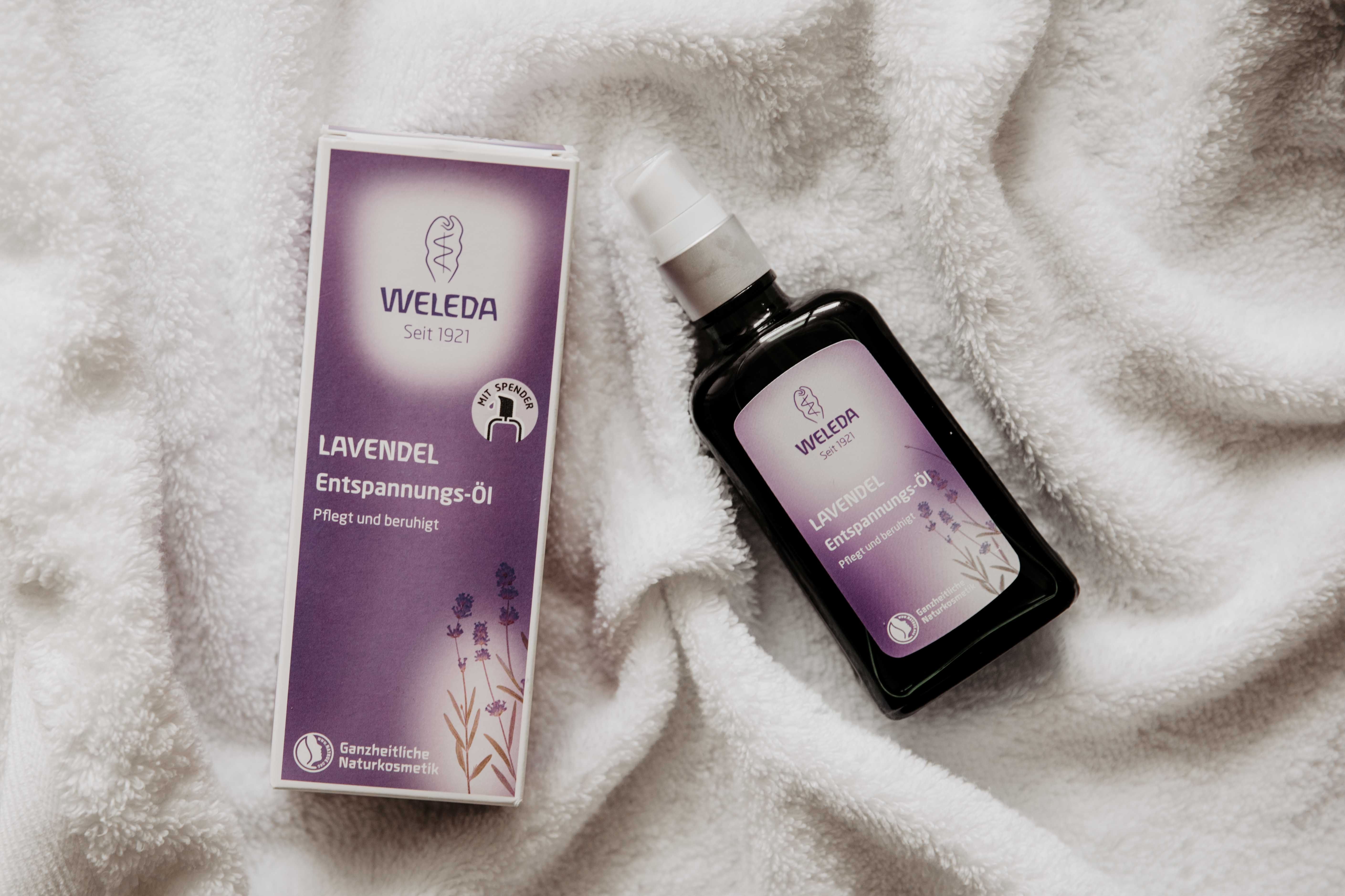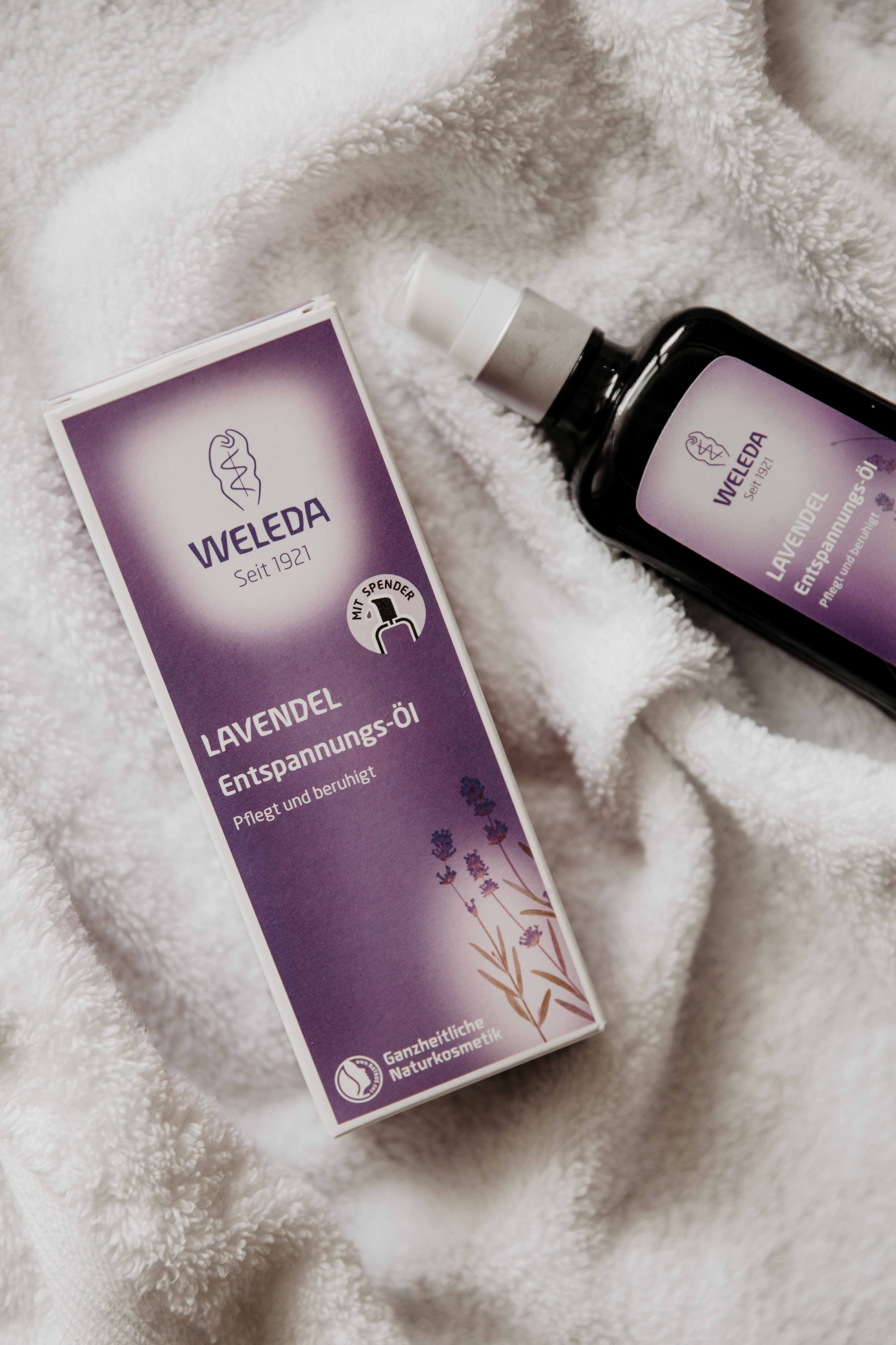 Das Öl gibt es in 9 verschiedenen Richtungen: Granatapfel Regenerations-Öl, Lavendel Entspannungs-Öl, Wildrose Harmonisierendes Pflege-Öl, Nachtkerze Revitalisierungs-Öl, Citrus Erfrischungs-Öl, Sanddorn Vitalisierendem Pflege-Öl, Calendula Massage-Öl, Arnika Massage-Öl und Birke Cellulite-Öl. Das Lavendel Entspannungs-Öl besteht aus Mandel- und Sesamöl und hat somit einen hohen Anteil an ungesättigten Fettsäuren. Der Duft vom ätherischen Lavendelöl wirkt beruhigend und entspannend und fördert somit gesunden Schlaf. Weleda bezieht das Bio-Lavendelöl übrigens aus Moldawien und verpackt es in einer Glasflasche, die zu 85% aus recycelten Materialien besteht.