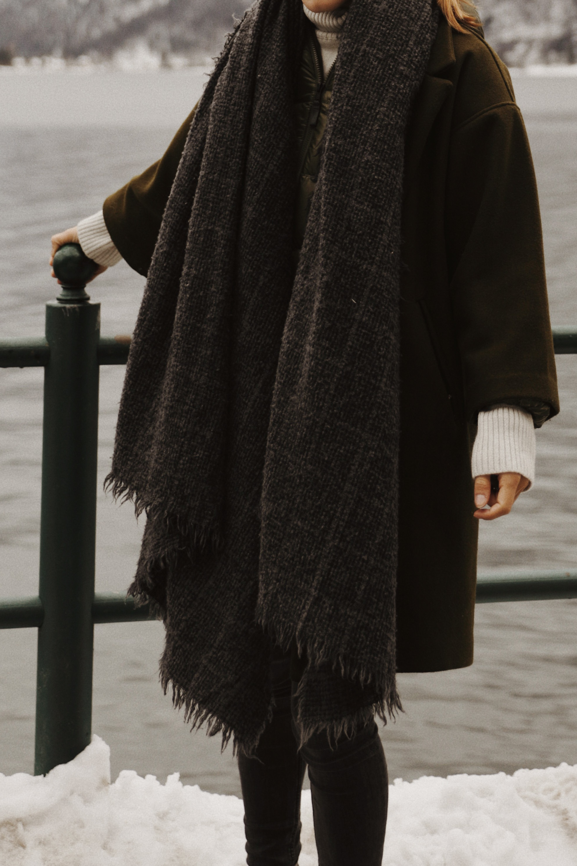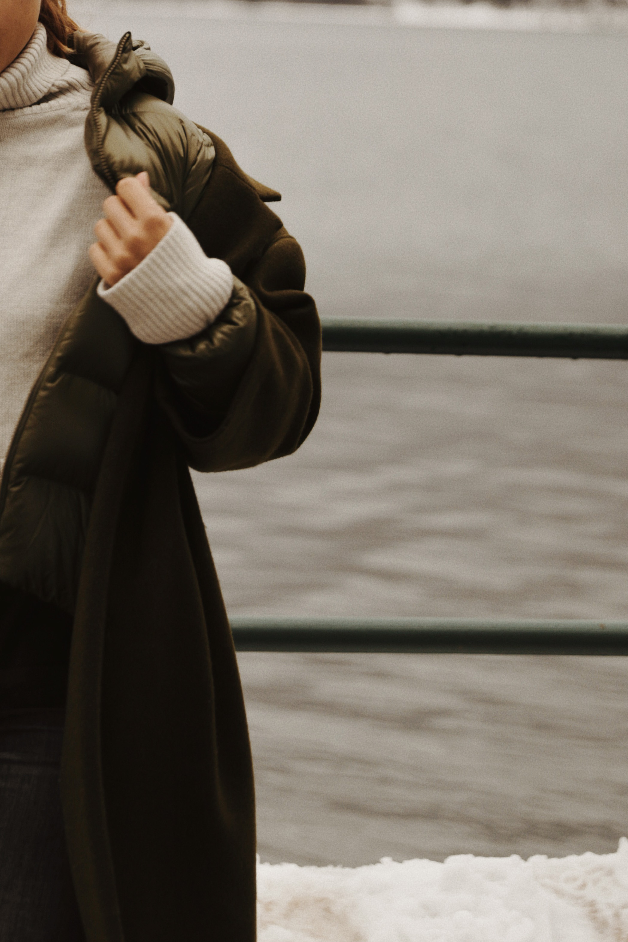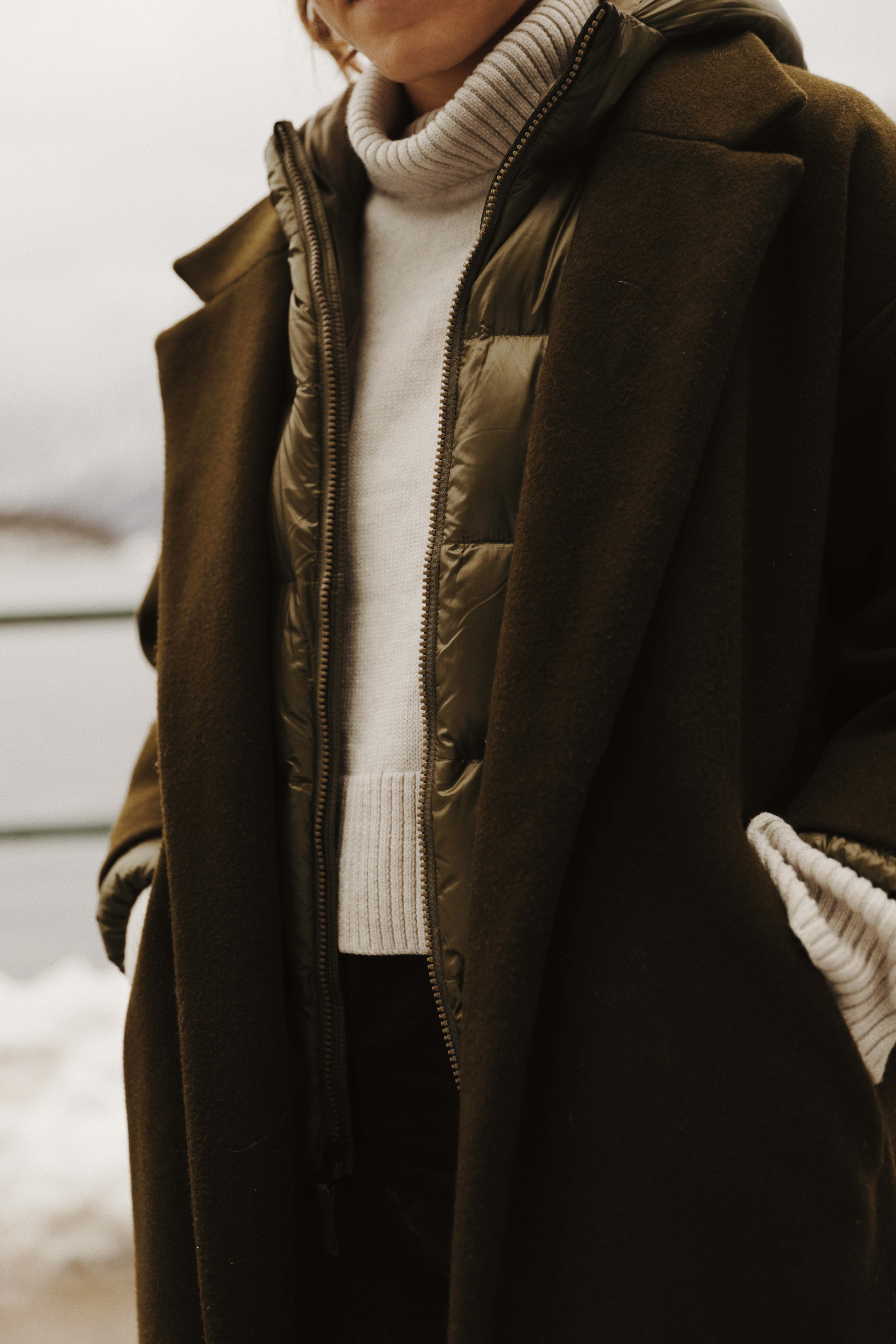 coat SARAH MAJ (FROM MAROKKO) / jacket PATAGONIA / turtleneck sweater ARITZIA (FAIR OPTION) / scarf DESTIN / shoes DR MARTENS (VEGAN OPTION) / jeans ZARA (FAIR OPTION) / jewelry ANNA IJ
