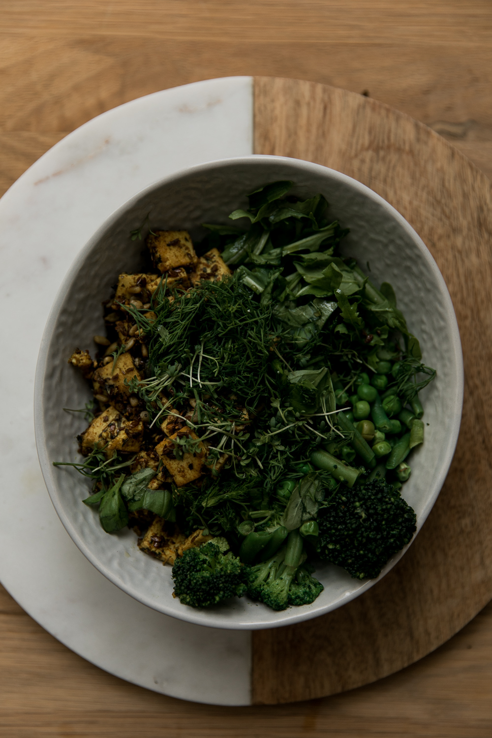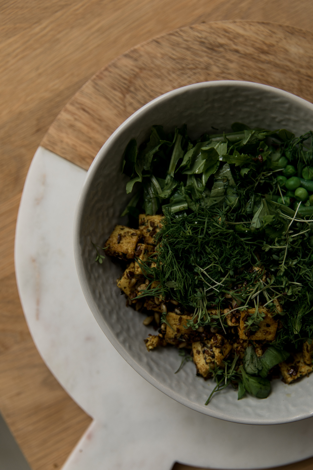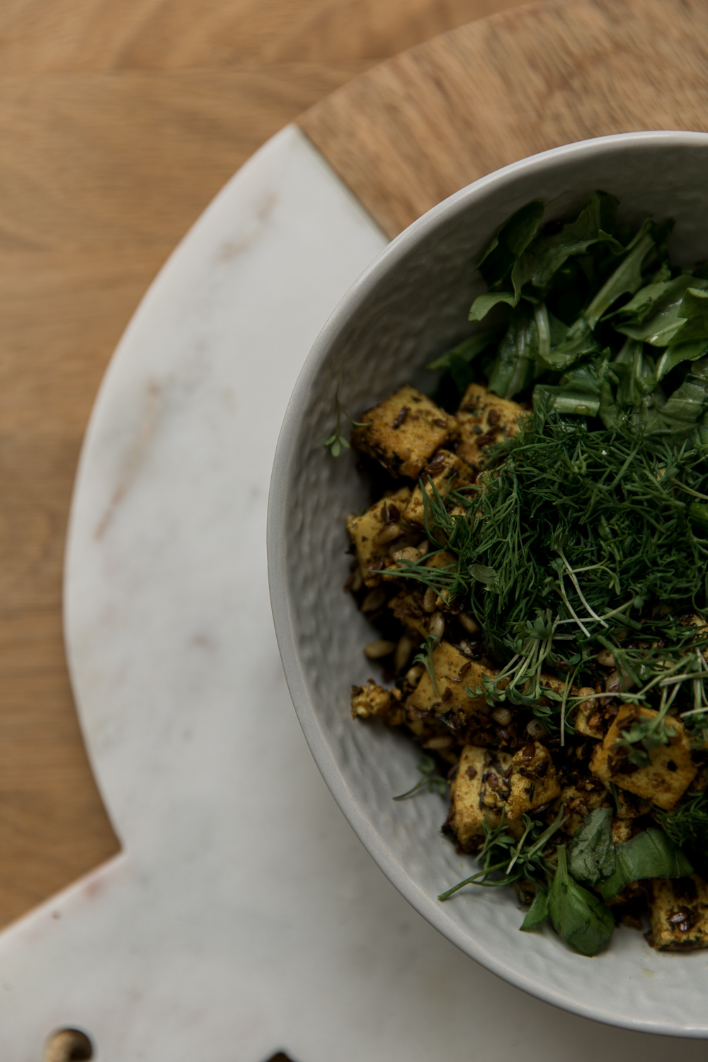 - Tofu in kleine Würfel schneiden und in einer Pfanne mit Olivenöl, Curry Pulver (und eventuell Cayennepfeffer), Leinsamen, Sonnenblumenkernen und Kürbiskernen bei mittlerer Hitze anbraten. Kurz bevor der Tofu die gewünschte knusprige Konsistenz erreicht, die Temperatur zurückdrehen und die Kräuter, sowie die Sojasauce untermischen und nochmals kurz anbraten.