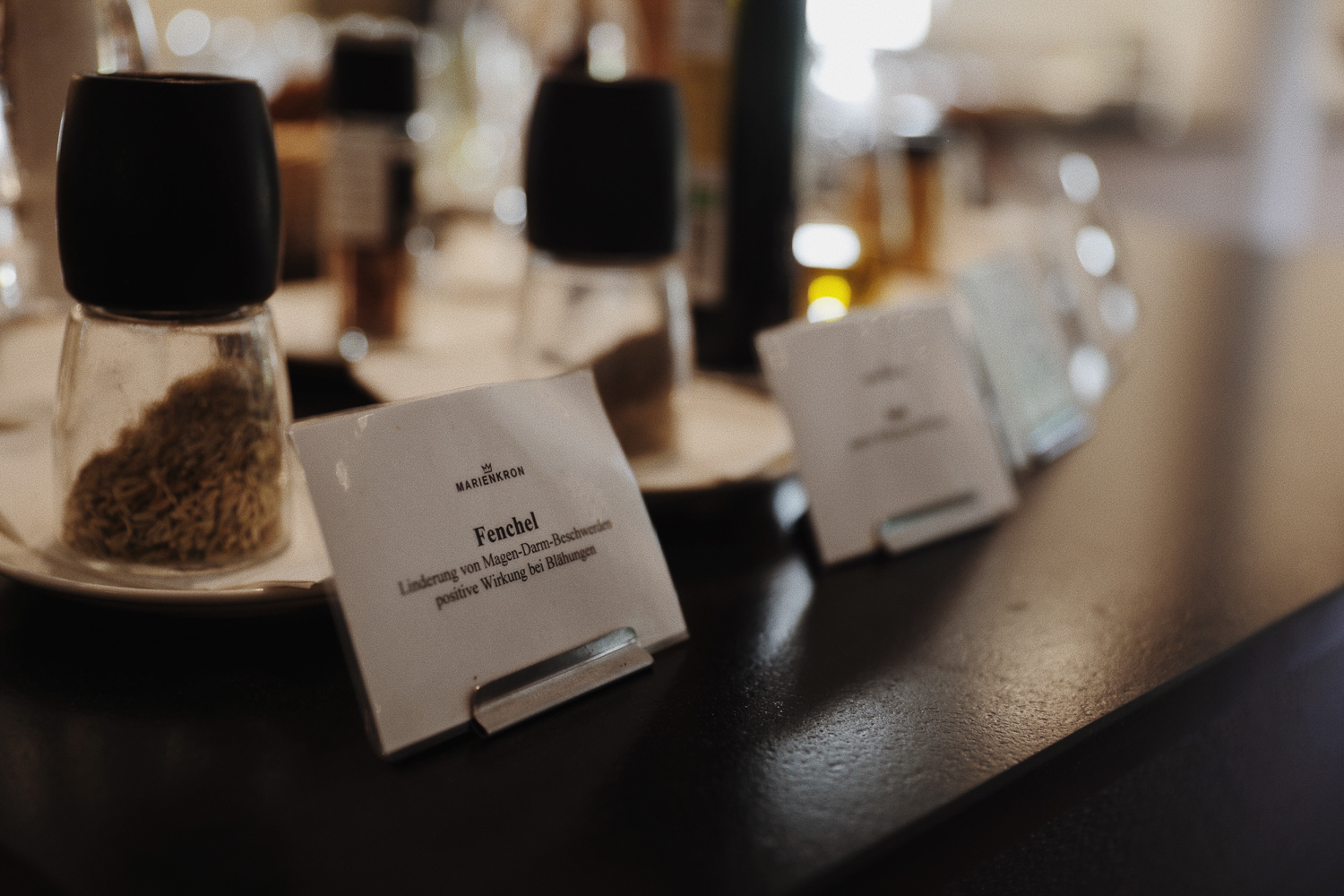 - Gewürze und Kräuter: Der eigene Kräutergarten vor der Tür lässt es schon vermuten – das Marienkron glaubt an die Kraft der Pflanzen. Egal ob bei den Teestationen oder beim Essensbuffet, man findet die richtigen Kräuter für jede Tageszeit und für jeden Einsatzbereich!