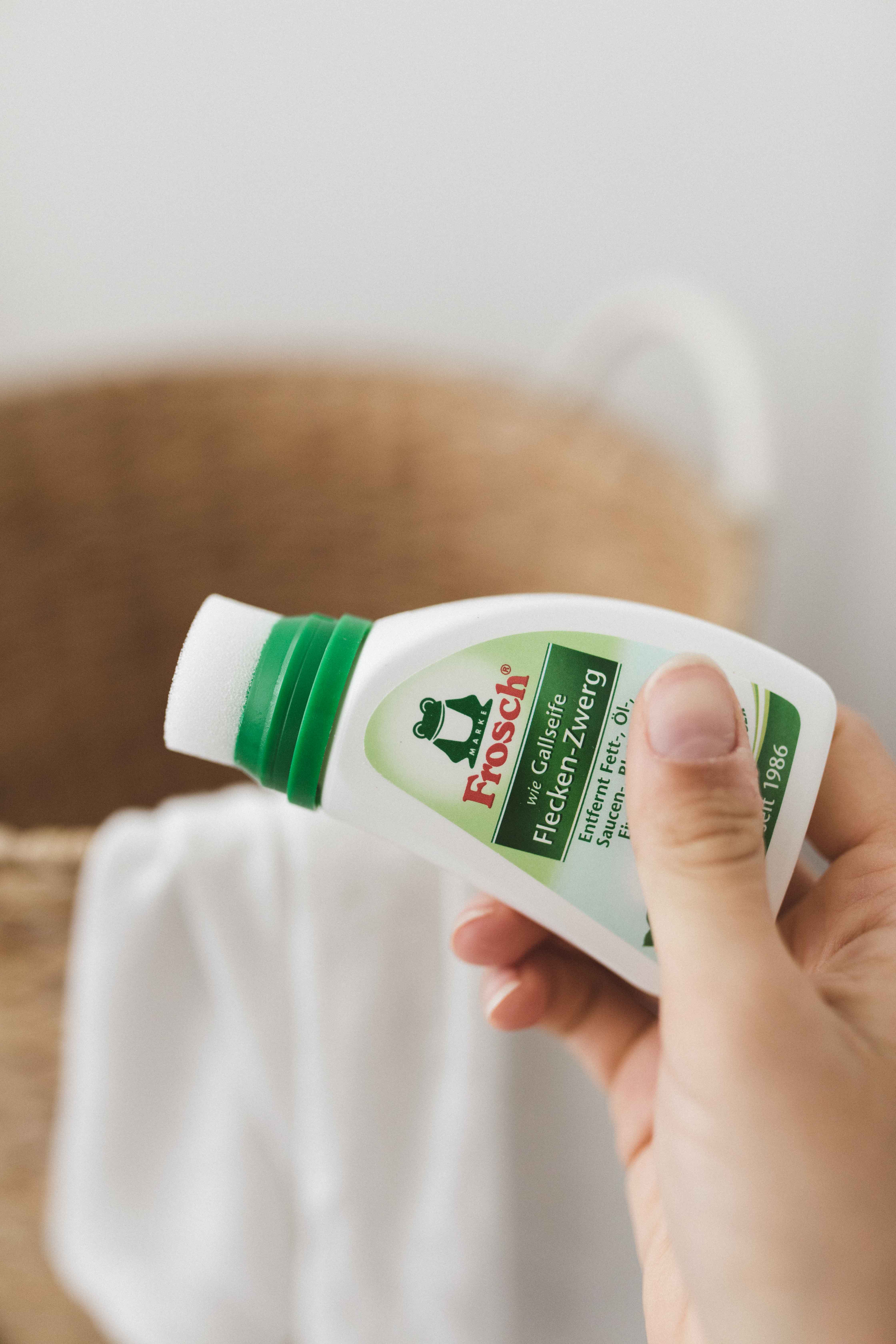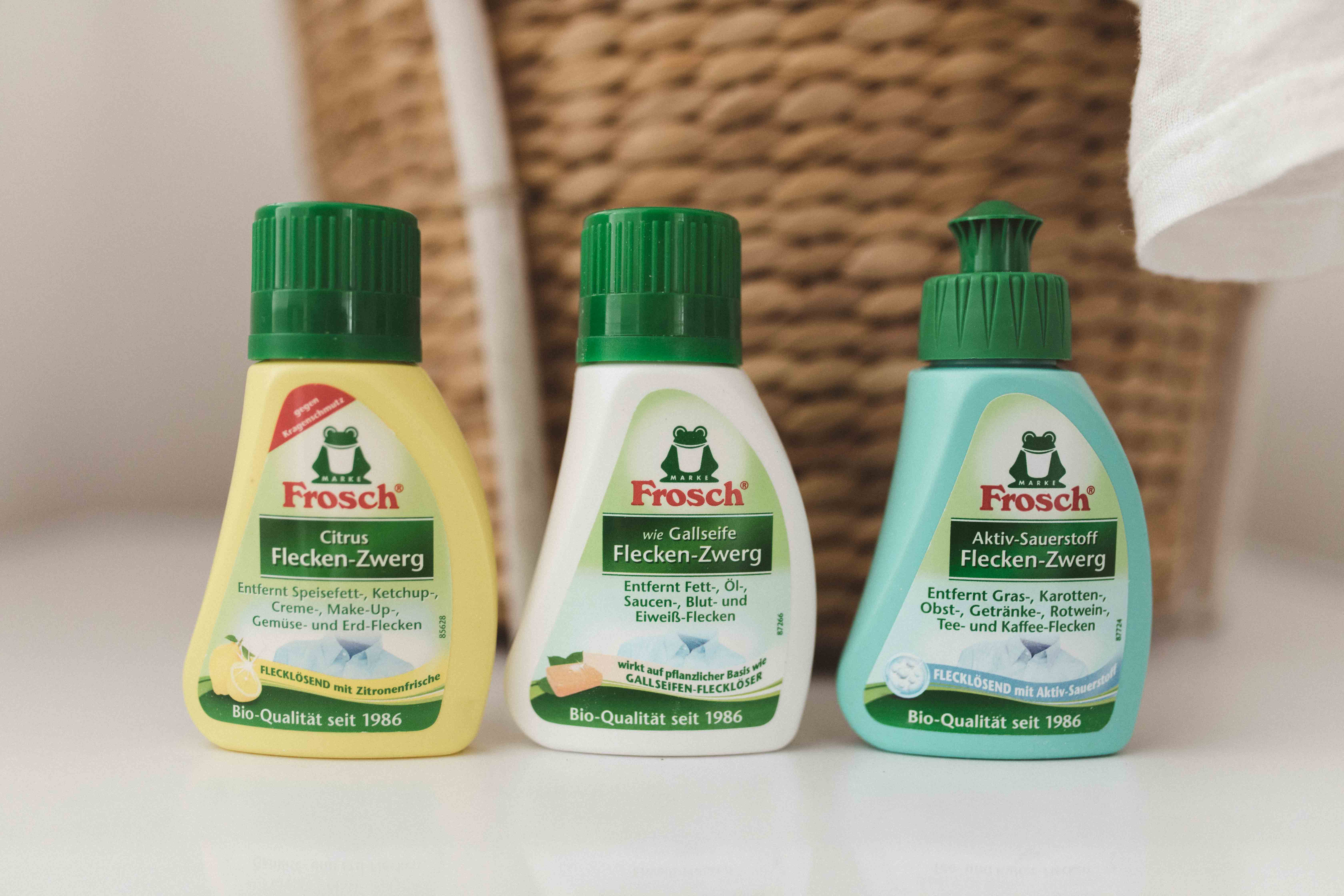 Oft werden gewisse Kleidungsstücke auch einfach zu oft gewaschen. Jeans kommen bei mir beispielsweise sehr selten in die Waschmaschine. Mit dem Flecken-Zwerg von Frosch beseitige ich gröbere Flecken und lüfte manche Kleidungsstücke auch einfach gut durch.